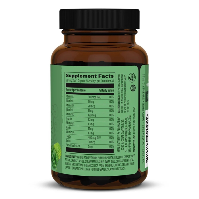 Sunwarrior Multi-V to w pełni roślinna multiwitamina pozyskiwana wyłącznie z całych owoców, warzyw, nasion i grzybów. Formuła opiera się na naturalnych, nieprzetworzonych źródłach witamin, bez dodatku syntetycznych substancji. Każda kapsułka jest delikatna, łatwa do połknięcia i w 100% wegańska — idealna dla osób, które szukają czystego i prostego sposobu na codzienne uzupełnienie kluczowych składników odżywczych.